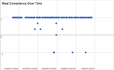 This chart counts cheat days as compliant, but I still need to tweak the cheat days to get the right amount of carb intake and right duration of carb refeeding. I think I went overboard a few times, and that might explain why at the moment I'm only down about a pound from my starting weight. Still, I'm learning a ton. Interesting stuff, nutrition.
